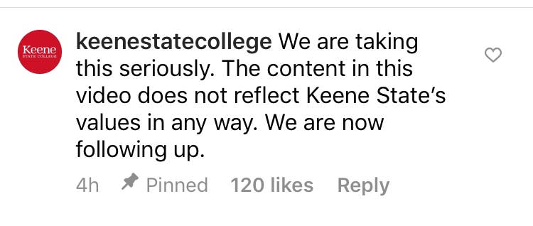 "We are taking this seriously. The content in this video does not reflect Keene State's values in any way. We are now following up."