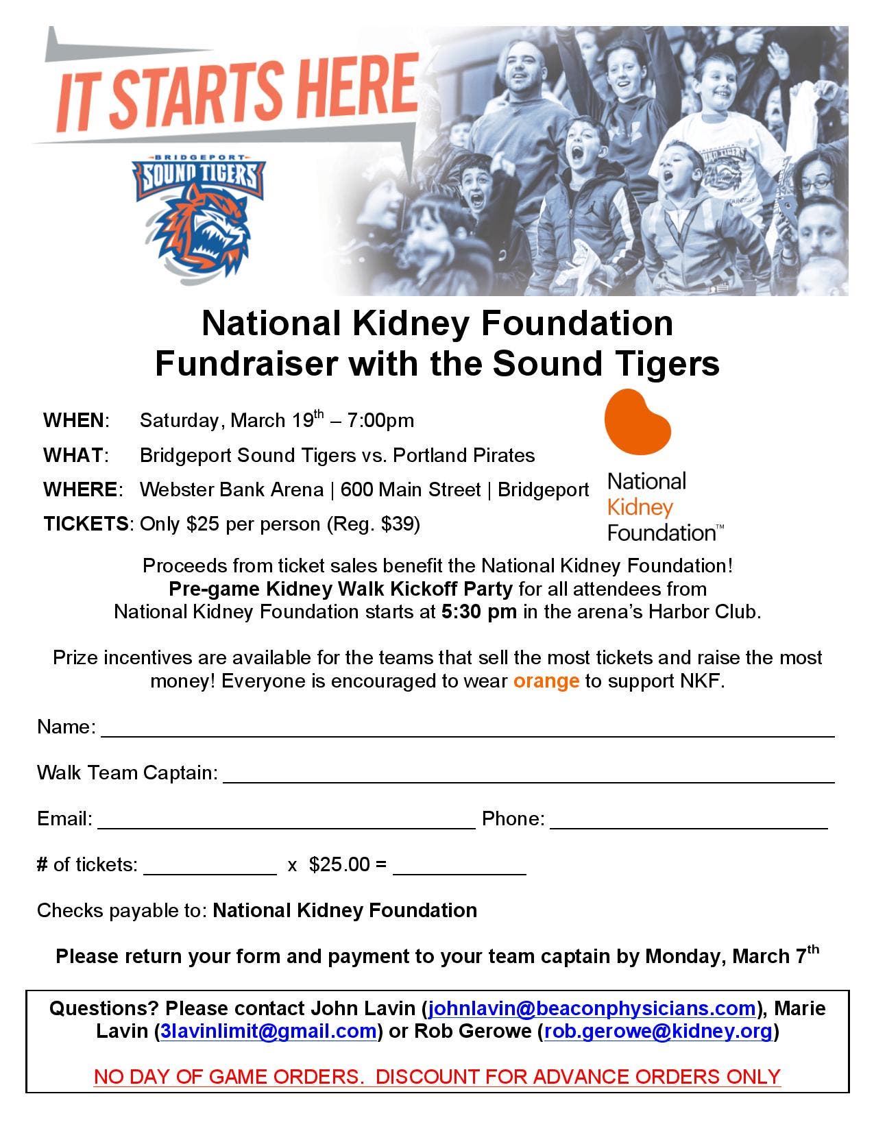 Come join the National Kidney Foundation on March 19th for our Kick-Off Event with the Bridgeport Sound Tigers!