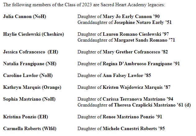 “Sacred Heart legacy is again strongly represented in this class,” announced Director of Admissions Elaine Lamboley ’60 in welcoming the Class of 2023. “We are particularly struck with the number of alumnae who are sending their daughters to Sacred Heart. The presence of these young women at the Academy is a testament to the importance that families place on the values learned here, and their desire to ensure that the Sacred Heart tradition continues.”