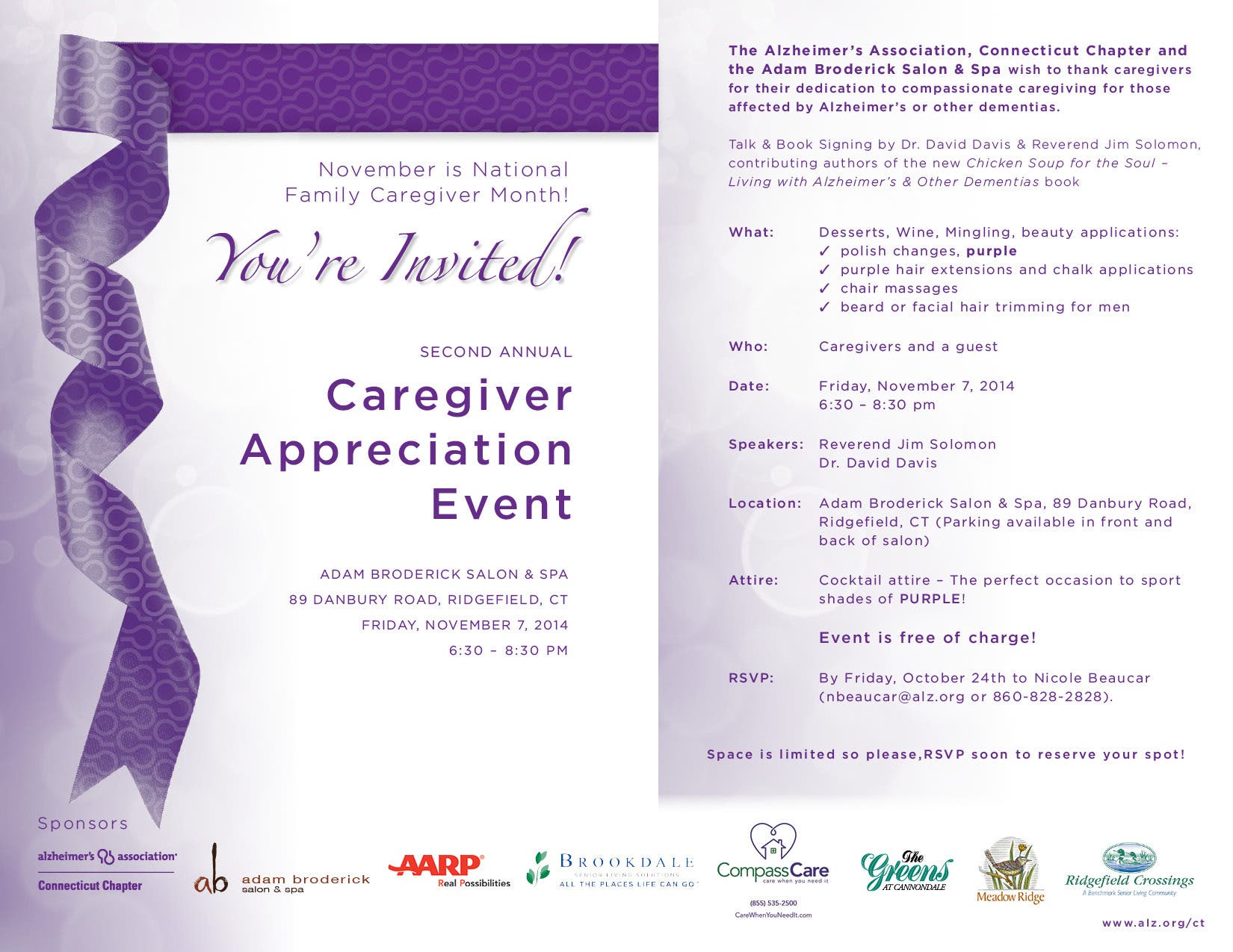 In honor of National Family Caregiver Month, the Adam Broderick Salon and Spa, located at 89 Danbury Road in Ridgefield, will be hosting the Second Annual Caregiver Appreciation Event in partnership with the Alzheimer’s Association Connecticut Chapter. The event will take place on the evening of Friday, November 7, from 6:30 p.m. – 8:30 p.m.