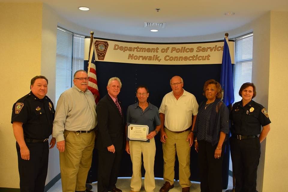 Photo: From left, Deputy Chief Ashley Gonzalez, Commissioner Charles Yost, Mayor Harry Rilling, Michael Golden, Edward Brennan, Commissioner Fran Collier-Clemmons and Deputy Chief Susan Zecca. Photo credit: Norwalk Police Department