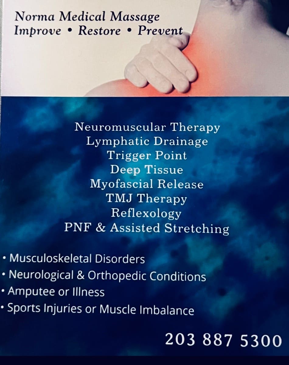 Norma Medical Massage provides therapeutic massage therapy sessions with an outcome-based approach to relieve muscle pain, muscular soreness, neck stiffness, increase flexibility, range of motion, reduce stress-related conditions, improve poor posture, coordination, strength and stability for overall musculoskeletal health. Prompt action is key in order to mitigate the progression of symptoms.