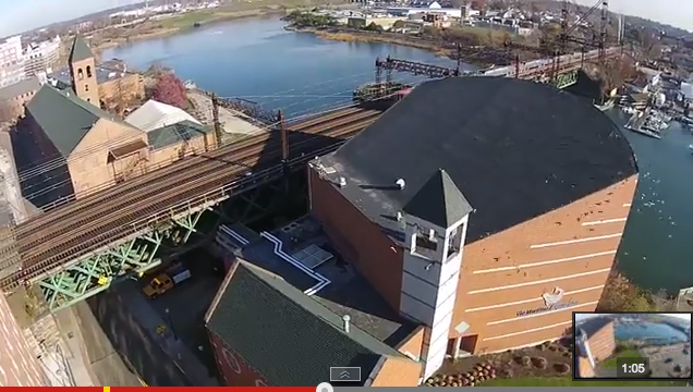 Here’s a video, silent and only one minute long, showing a view you don’t often see: the Maritime Aquarium in South Norwalk from hundreds of feet above.