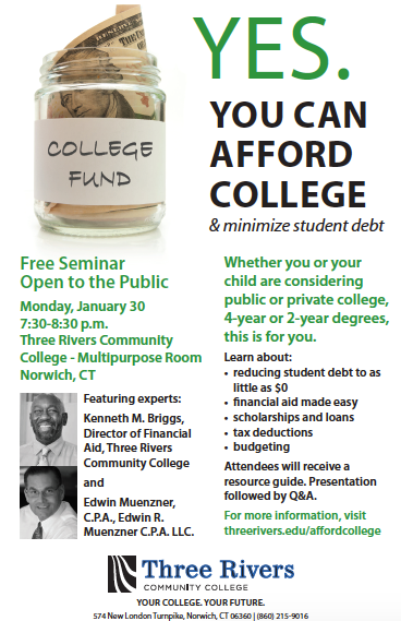 It will be presented by experts in the field of financial aid, taxes and personal finances – Kenneth Briggs with over 18 years of experience in Financial Aid, currently Acting Director of Financial Aid at Three Rivers Community College, and Edwin Muenzner, C.P.A., founder of the firm Edwin Muenzner C.P.A., LLC, and Chair of the Business Department at Three Rivers Community College.