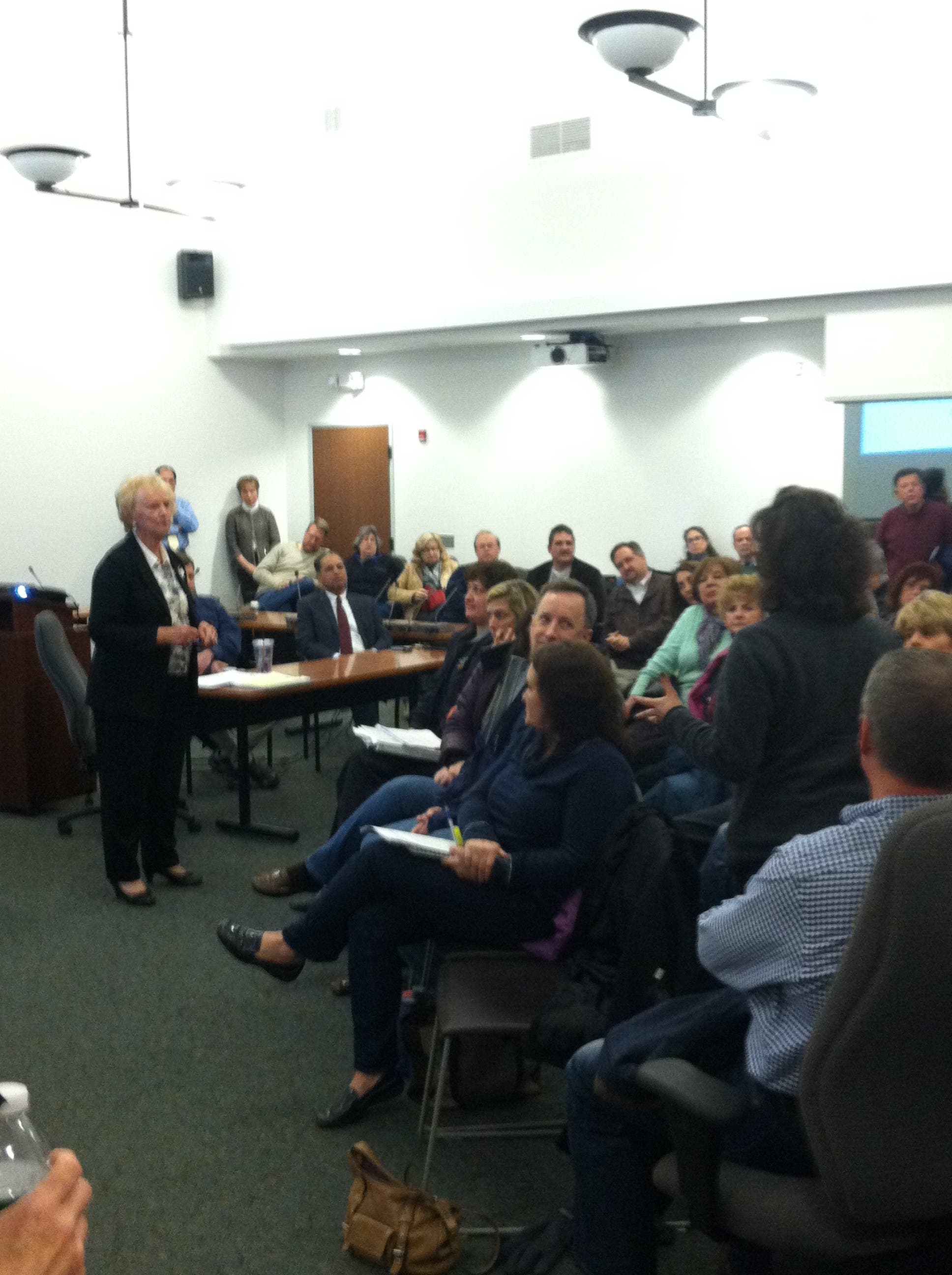 Caption: Newtown First Selectman, Pat Llodra, handles questions from a tough crowd at last night’s public meeting on how a $15 million gift from GE following the Sandy Hook Tragedy, should be used.