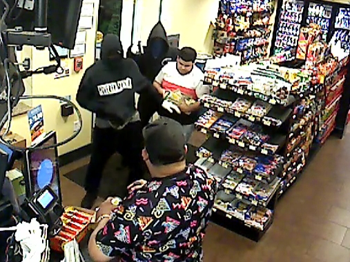 Two males entered the building of the rest area on the southbound side of the highway around 4:15 a.m. and displayed weapons. They were dressed in black hoodies and white gloves with their faces obscured. They left the area in a red couple-style Honda, State Police said.