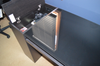 Dark brown laminate with tempered glass top, slide-out keyboard, top storage compartment, side open storage spaces
