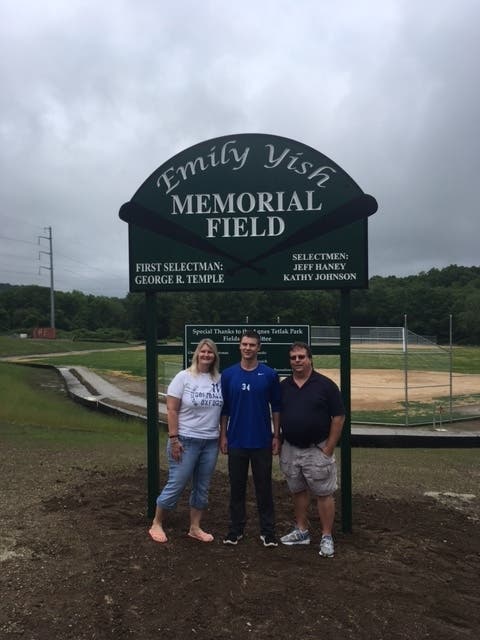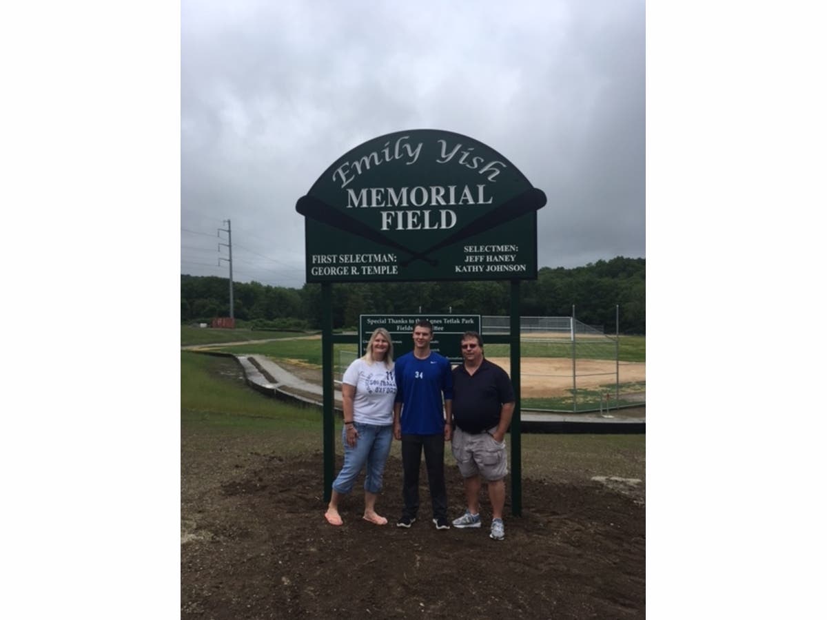 OXFORD, CT — Tracee Yish left, John Yish center and Dave Yish right were at a dedication Saturday for their late daughter Emily Yish, who had a field named in her memory at Tetlak Park. contributed photo. About 200 people showed their respects at the dedication.