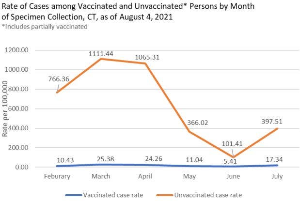 The Delta upgrade that makes it more likely to break through the protections normally afforded by vaccines is obviously concerning public health officials. In Connecticut, the rate of cases among vaccinated residents increased by nearly 12 cases per 100,000 population from June to July.