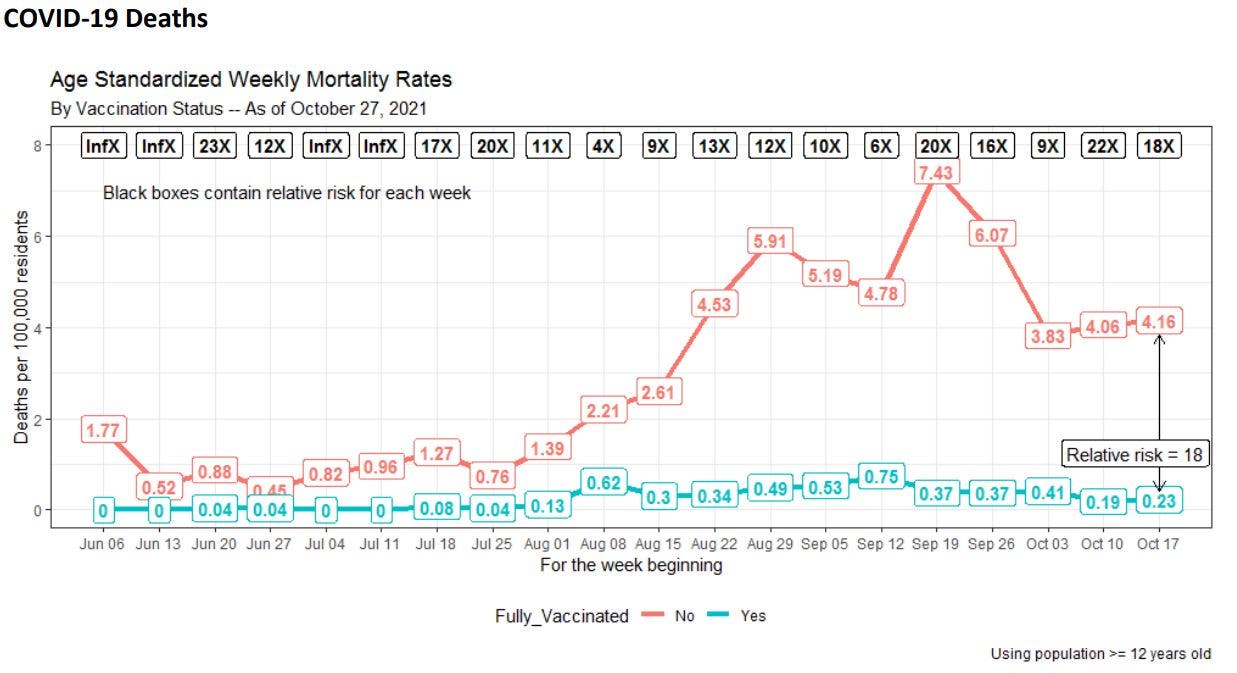 The latest data show unvaccinated residents have an 18 times higher risk of dying from the coronavirus, compared to the vaccinated. Their risk of hospitalization is also 18 times greater.