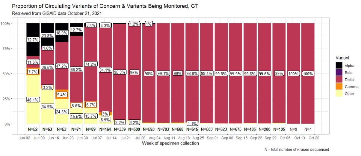 Based on data released by the Global Initiative on Sharing All Influenza Data on Oct. 28, the delta variant continues to have a lock on coronavirus cases in Connecticut. The chart below shows the change in proportion of circulating variants of concern by week. Data includes sequences from specimens with dates of collection from March 2, 2020, through Oct. 19, 2021.