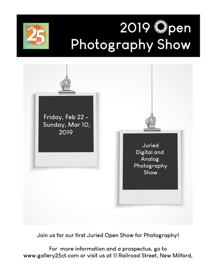 Who can apply? The call for photographers is open to both analog and digital photography. Images may be edited in the darkroom or with software. No multimedia work. All images must be taken by photographer. Delivery for all work will be Monday, February 18th from 3:30-7:30PM only. For a copy of the prospectus, visit www.gallery25ct.com, email Gallery25newmilfordct@gmail.com or pick up a copy at the gallery.