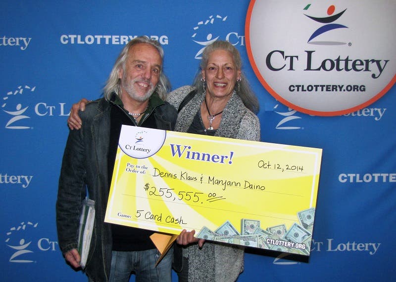 Maryann Daino and Dennis Klaus relocated to Connecticut from New York after their home was destroyed by Hurricane Sandy. The two split the $174,544 winnings on Monday that they will use to help pay for a new home.