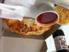 About 15 minutes after you put your order in, you hand them ten dollars and they hand you a piping hot calzone, fresh from the oven, and you, armed with naught but a flimsy plastic fork and knife, a small cup of marinara sauce, and the raw determination born of unbridled hunger, make gastronomical war against the most formidable of foes: the pepperoni calzone.