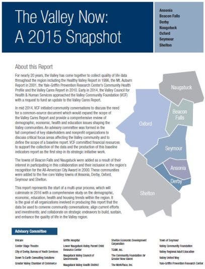 DERBY (May 27, 2015) – The Valley Community Foundation (VCF) is pleased to announce the release of The Valley Now: A 2015 Snapshot, representing the start of a multi-year process that will culminate in the creation of a community index for the Lower Naugatuck Valley towns in 2016. The snapshot report includes a brief summary of changing demographics and population growth, health indicators, employment rates, education and student achievement, income and accessibility to basic needs among residents in the region.