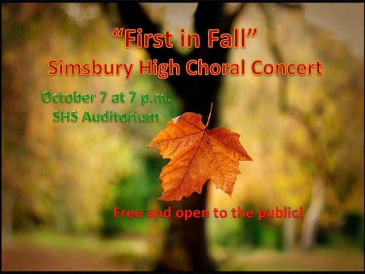 A free and open-to-the-public fall choral concert will be presented by the Simsbury High Music Department on Wednesday, October 7, 2015. The concert will begin at 7 p.m. in the SHS auditorium and will last about an hour and 15 minutes.