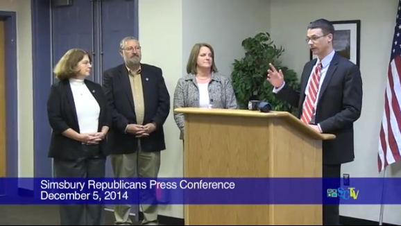 Sean Askham, chairman of the Simsbury Republican Town Committee and a selectman, along with Nancy Hasse, another GOP selectman, read their prepared statements, as published Friday by Simsbury Patch. As the video recording (5 minutes, 25 seconds long) shows, they both seem tense.