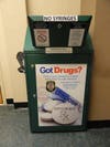 The medication drop box is a large green metal box in the lobby of the police department. It is bolted to the floor by the dispatch window. Once placed in the box it cannot be retrieved. The area is also under 24-hour camera surveillance.