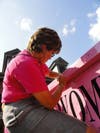 They sell T-shirts and stickers at each stop. People who have or survived a bout with cancer are invited to write messages on the trucks, as well as those who have lost loved ones to the disease.