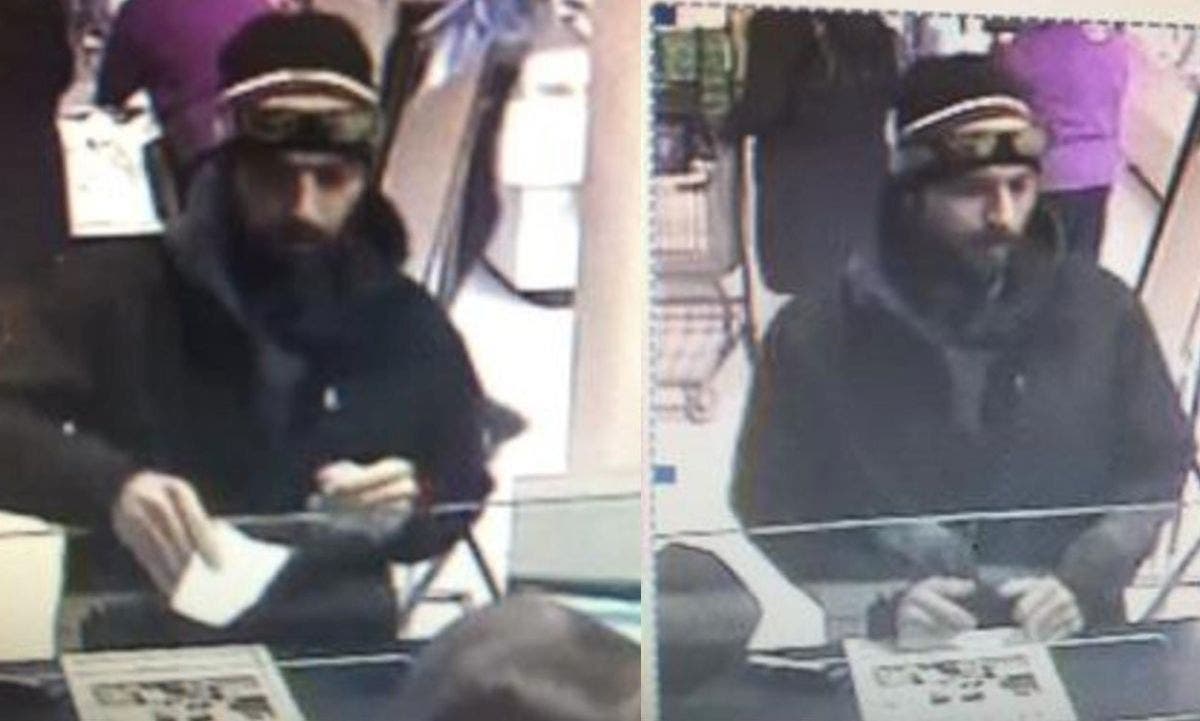 The man is described as a white male, about 5-feet-7 to 5-feet-9 inches tall, in his late 20s to early 30s with a dark full beard, wearing a black ski hat, black ski jacket and sunglasses.