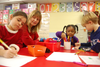 During the celebration, students rotated between different colored tables. Each “station” represented a different activity. With a little help from volunteers, the kindergartners decorated gift tags; wrote reflections illustrating what caring means or how they could show they care; designed “cheer” cards for elderly citizens; wrapped gifts; and created posters with caring messages.