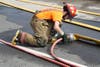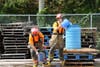 At Roll, Pump and Squirt, a three-member team of Katie Tsitaridis, Ryan Jano and Austin Bowe had to perform three tasks. First, Tsitaridis had to neatly roll a 50' length of hose. To complete the station, Tsitaridis helped Jano put on an Indian Pump (a portable water can that is carried on the back), and they advanced 40' and hit three targets with water from the Pump. Then they left the Indian Pump and assisted Bowe advance a charged hose line 75' and knock down a target with water from the hose line.