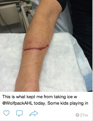 “This is what kept me from taking ice w @WolfpackAHL today,” she wrote. “Some kids playing in arcade knocked over metal machine onto my arm. 25 stitches!”