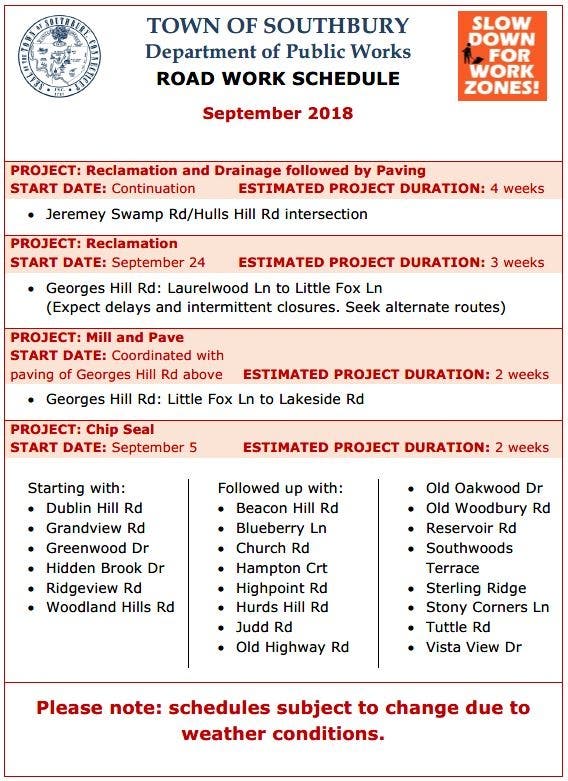 SOUTHBURY, CT — The town has released a list of road work projects that will be undertaken in September.