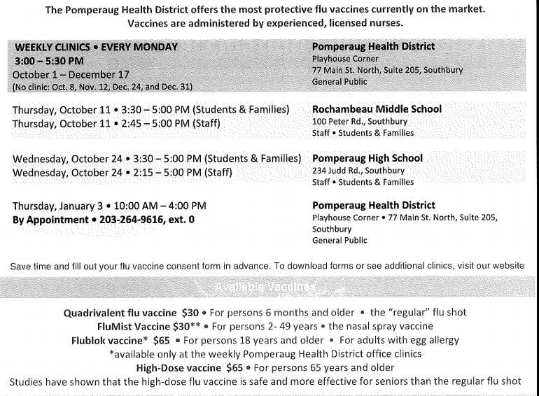 The Pomperaug Health District has several upcoming flu clinics for the month of October.