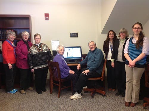 Left to right - Molly Curry, Elizabeth Tishion, Priscilla Wismar (all members of The Heritage Village Genealogy Club), seated Margaret Hill and Richard Hill, Katherine Mostacero, Reference Librarian, Shirley Thorson, Head Librarian, Emily Oumano, Reference Librarian.
