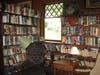 The building features a cozy reading corner on the right as you enter, and a big library table on the left. Four niches that are five feet deep and three sides contain most of the collection along the back of the room.