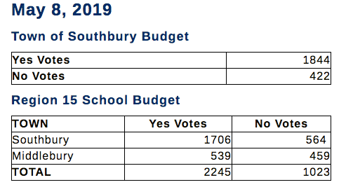 The town budget was approved by a tally of 1,844 to 422. The Region 15 budget was approved by a total vote of 2,245 to 1,023. The vote was much closer in Middlebury where the school budget passed by less than 100 votes.