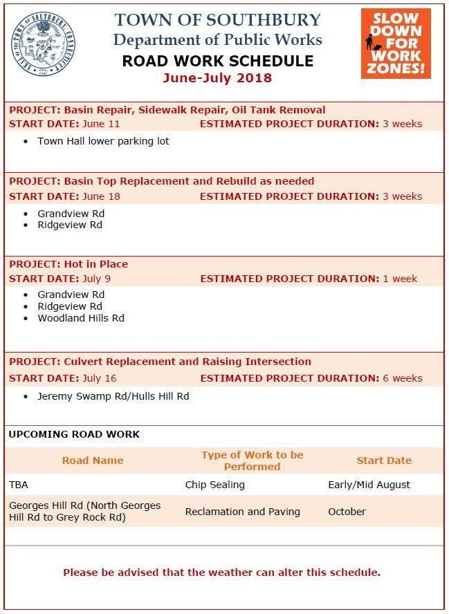 Southbury Releases Road Work Schedule