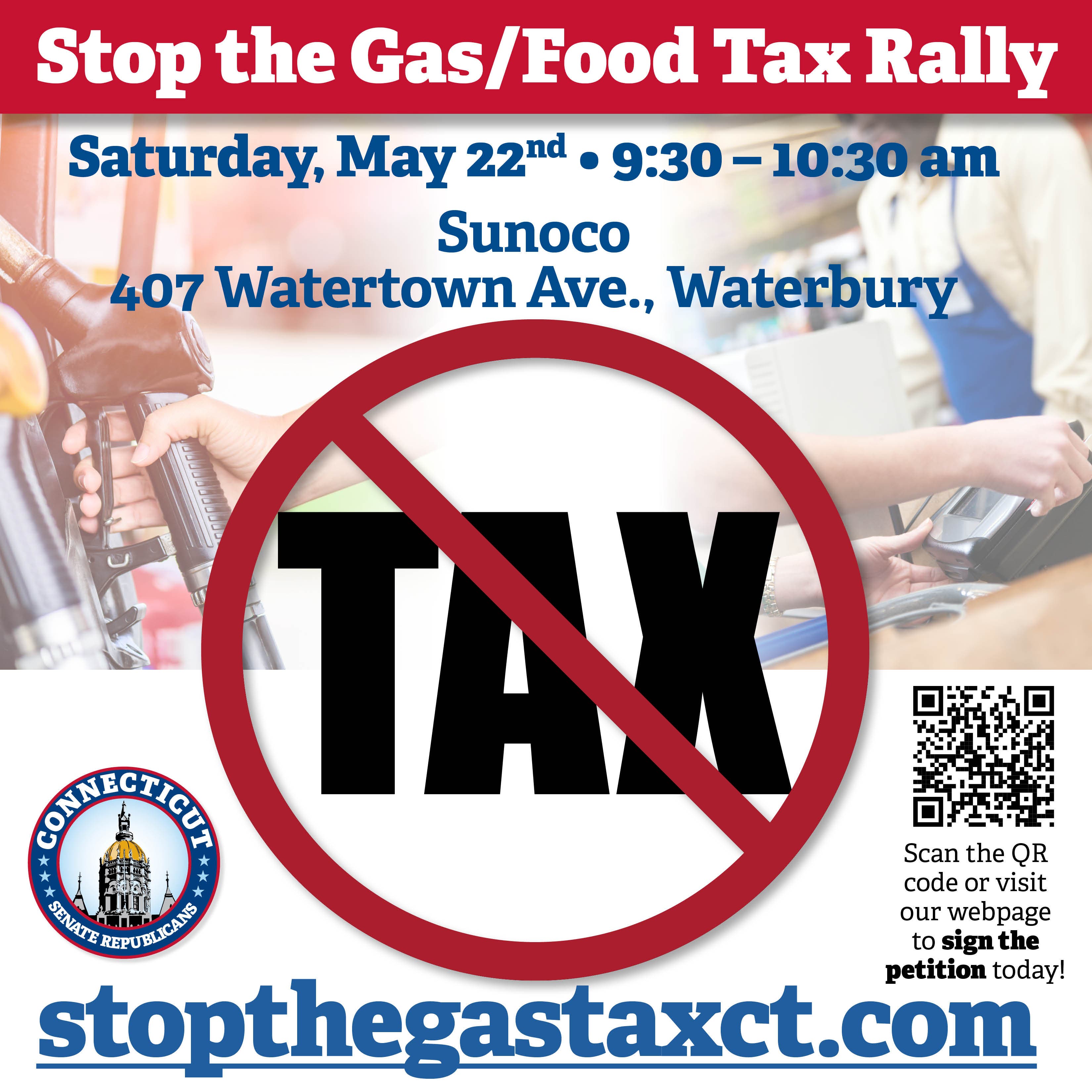 WATERBURY, CT — Connecticut's Senate Republicans have organized a "Stop the Gas Tax/Food Tax" rally for 9:30 a.m. to 10:30 a.m. on Saturday at the Sunoco station on Watertown Avenue in Waterbury. See the flyer below.