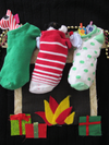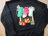 I found small toys, mis-matched socks, and Mardi Gras beads from the last Bar Mitzvah we attended and got to work. I made a "Stockings hung by the chimney with care" themed sweater. I took scraps of fabric left over from shadow box orders, some felt from a school project, a little ribbon, and my handy-dandy glue gun and put together this masterpiece: