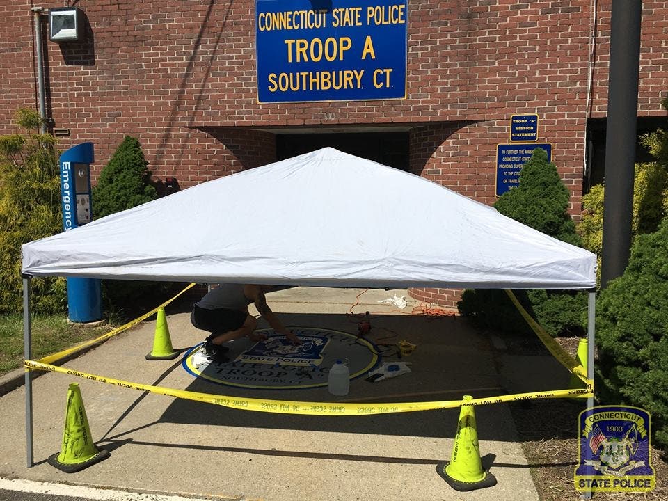Troop A-Southbury entrance is getting a makeover. Today’s warm weather is a great day to highlight that those working outside can be at a higher risk to the effects of excessive heat. Tpr. Carvalho has set himself up to stay cool and hydrated as he works on a new logo at the entrance to Troop A-Southbury. Tpr. Carvalho has a background in graphics design and is using those skills to freshen up the entryway.