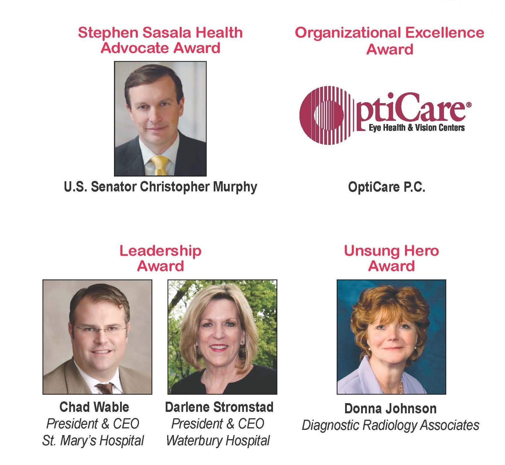 Recipients of the 2016 Waterbury Regional Chamber HCC awards are: Chad Wable, FACHE, St. Mary’s Health System and Darlene Stromstad, FACHE, Waterbury Hospital will both receive individual HCC Leadership Award; U.S. Senator Christopher Murphy will receive the Stephen Sasala Health Advocate Award; OptiCare PC will receive the HCC’s Organizational Excellence Award; and Donna Johnson, community relations liaison with Diagnostic Radiology Associates (DRA) will receive the HCC’s Unsung Hero Award.