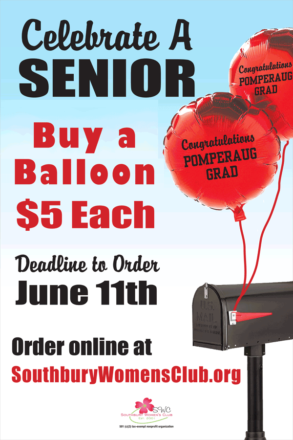 The Southbury Women’s Club will once again be selling 18 inch red mylar graduation balloons that say “Congratulations POMPERAUG GRAD.”