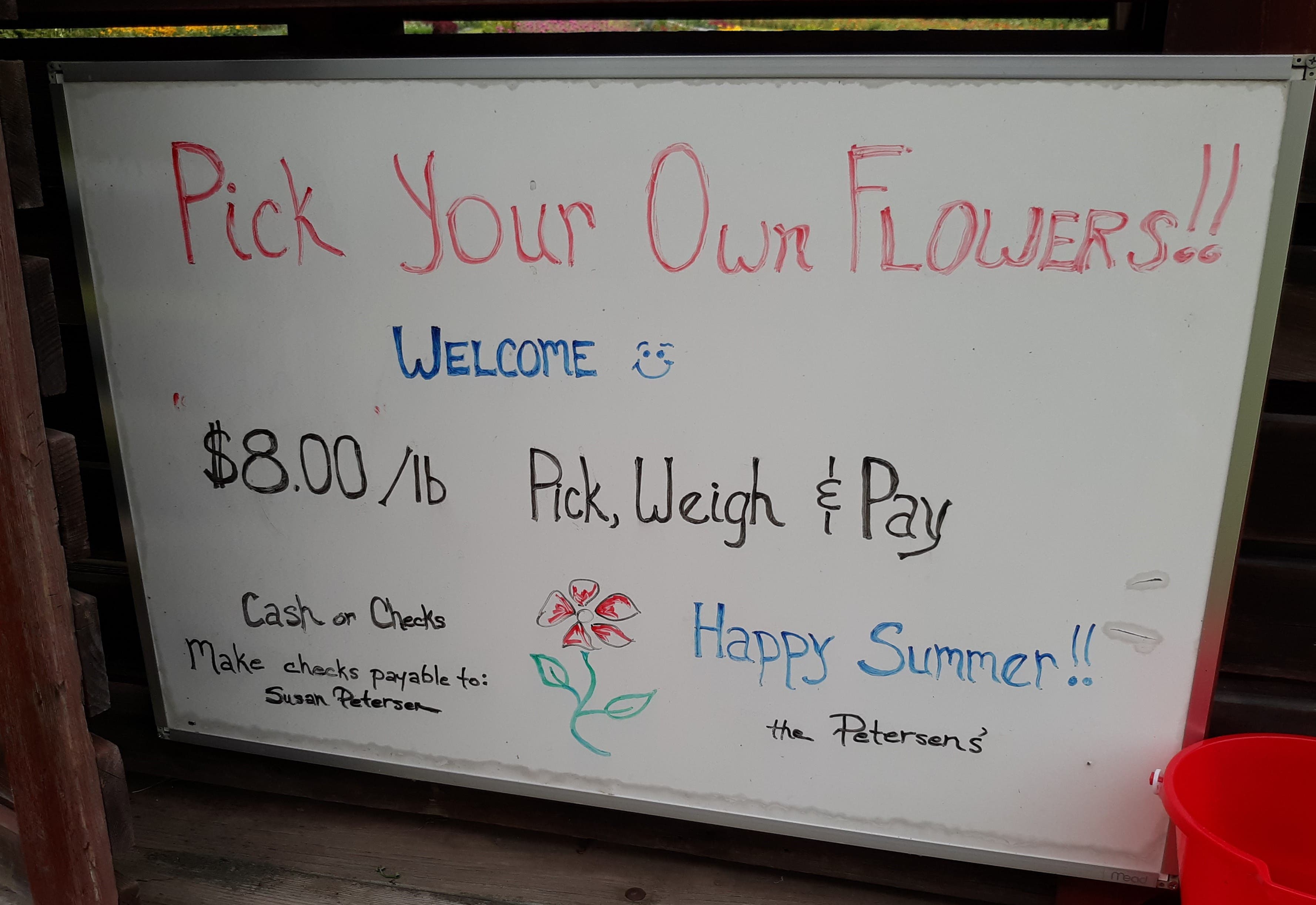 Asked about the farm's hours, Russell Petersen smiled and proclaimed, "Dawn to dusk!" It is open daily through September, and clippers and water containers are available for customer use.