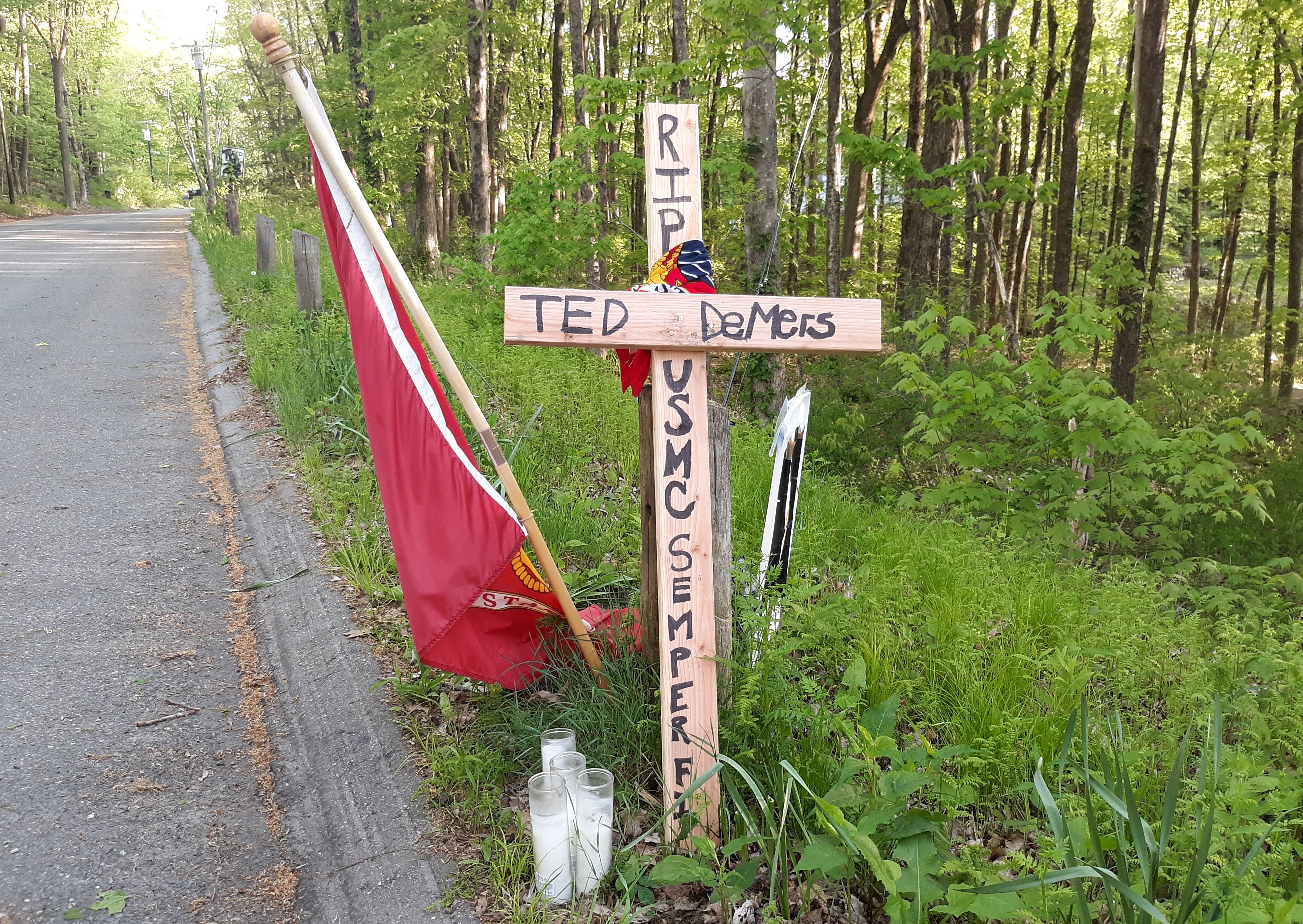 WILLINGTON, CT — Across the street from the country home he lived in for the past 35 years, a memorial to the late Theodore DeMers is filled with various elements from his life. Among them are a fishing rod, a flag bearing the insignia of the U.S. Marine Corps, a wooden cross containing his name and the Marine Corps motto "Semper Fi," and a handmade sign inscribed "You will be missed," atop which sits three photos of DeMers, two of which also include his wife of 42 years, Cyndi.