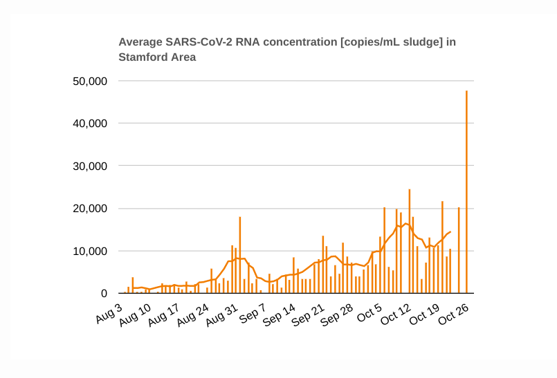 The SARS-CoV-2 ribonucleic acid, known as RNA, concentration in the wastewater from Bridgeport and Stamford spiked in the last week, according to data from the Yale School of Public Health.