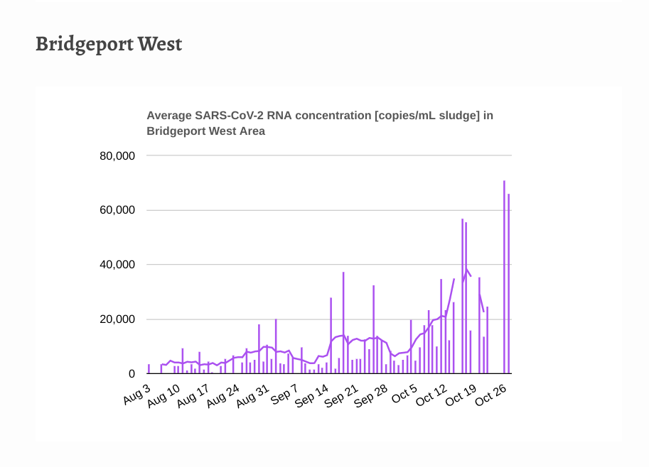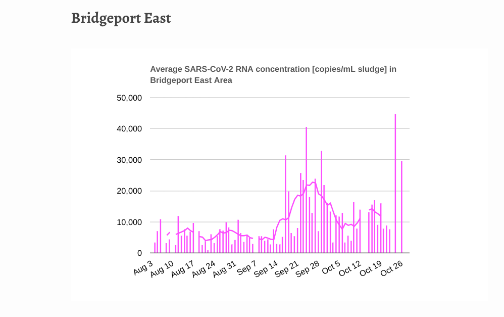 The Yale health graph shows the average concentration of the virus at Bridgeport East, which has been below 10,000 for months, began increasing in late September with the greatest spike seen this week to around 45,000.