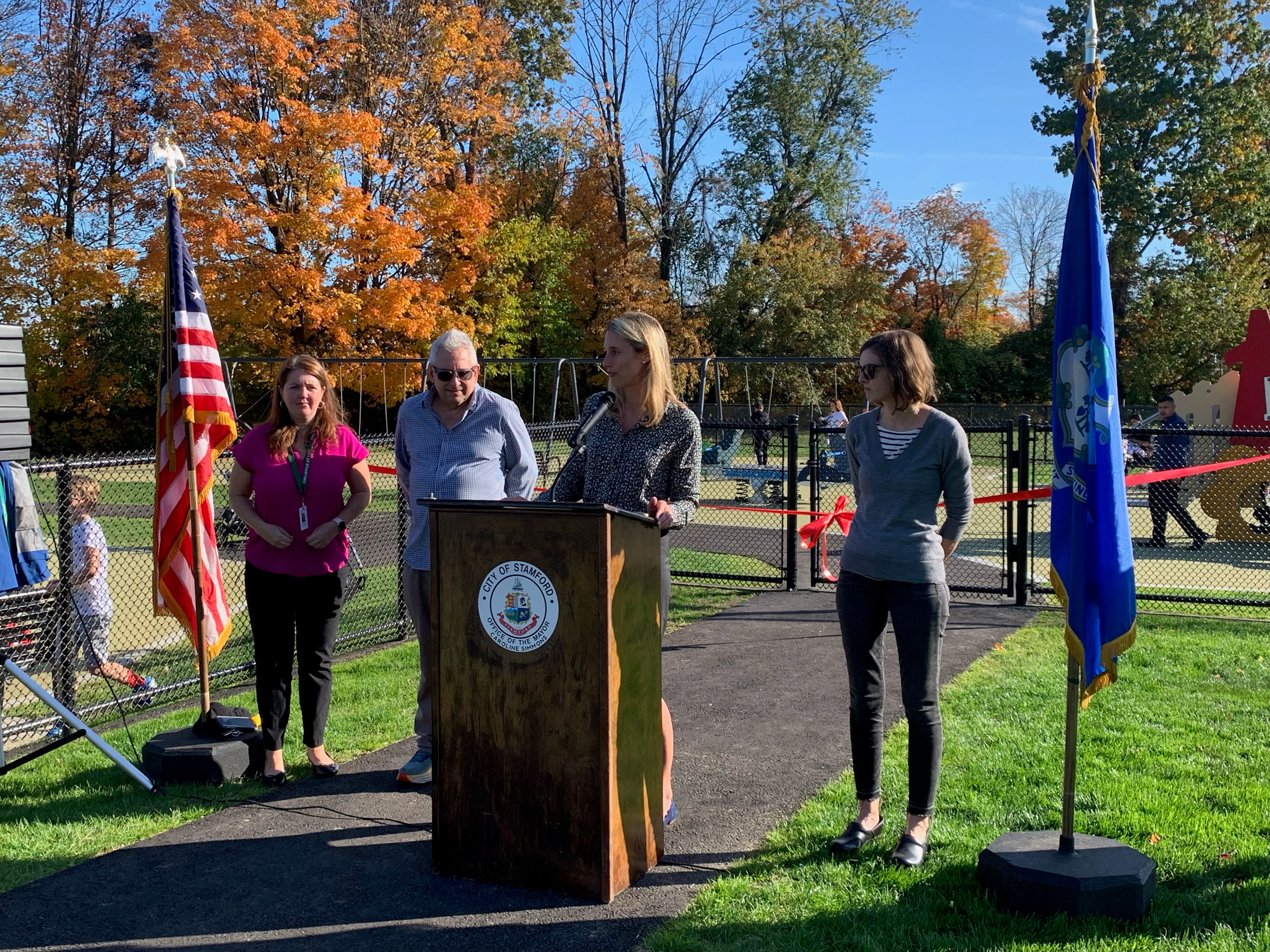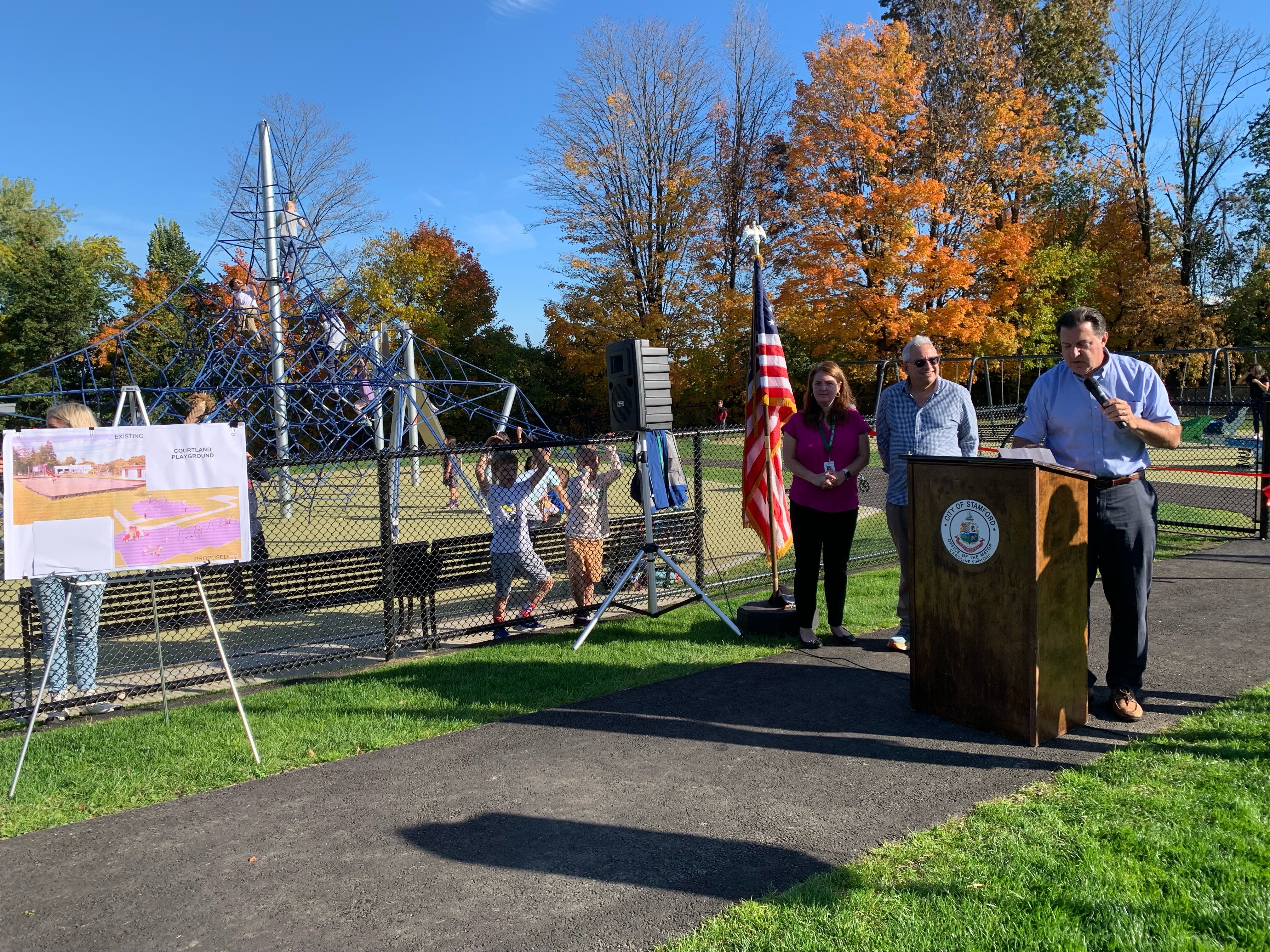STAMFORD, CT — After most of Wednesday was dreary and overcast, bright blue skies emerged just in time for the city of Stamford to unveil the new playground at Courtland Park, located at 39 Courtland Ave., in Glenbrook.