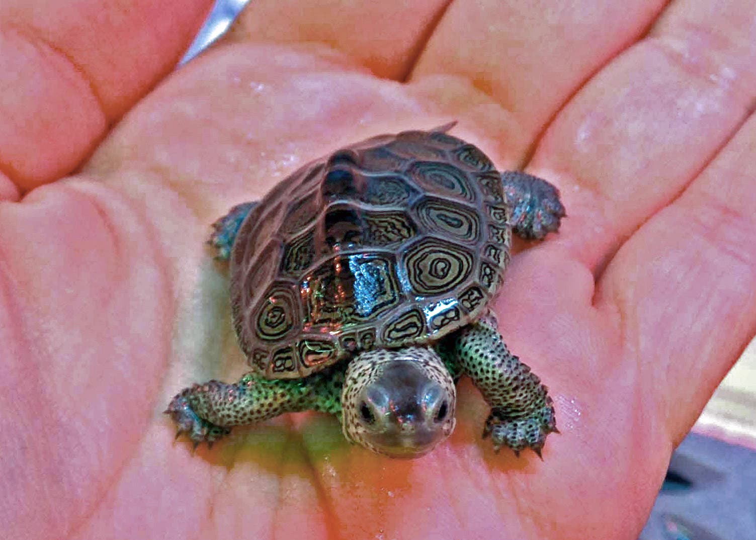 Diamondback terrapins are native to the salt marshes and tidal creeks of the sound in a habitat that extends from Cape Cod in Massachusetts to the entire Atlantic and Gulf Coast regions. When hatched, diamondback terrapins are the size of a nickel. The female grows to a foot long, the male half that size. They live for between 25 to 40 years, with a distinctive diamond pattern on the shell; each individual has its own unique markings.