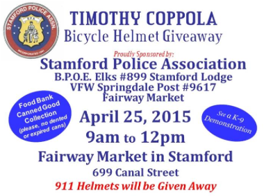 The Stamford Police Association's annual Timothy Coppola Bicycle Helmet Giveaway will be held on April 25.