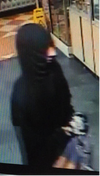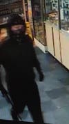 - Wearing a black hooded sweatshirt with a black bandana covering his nose and mouth