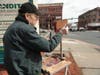 He’s out here today, "painting on the ground," facing west, toward the river, creating an under painting of the buildings flanking Washington Street.