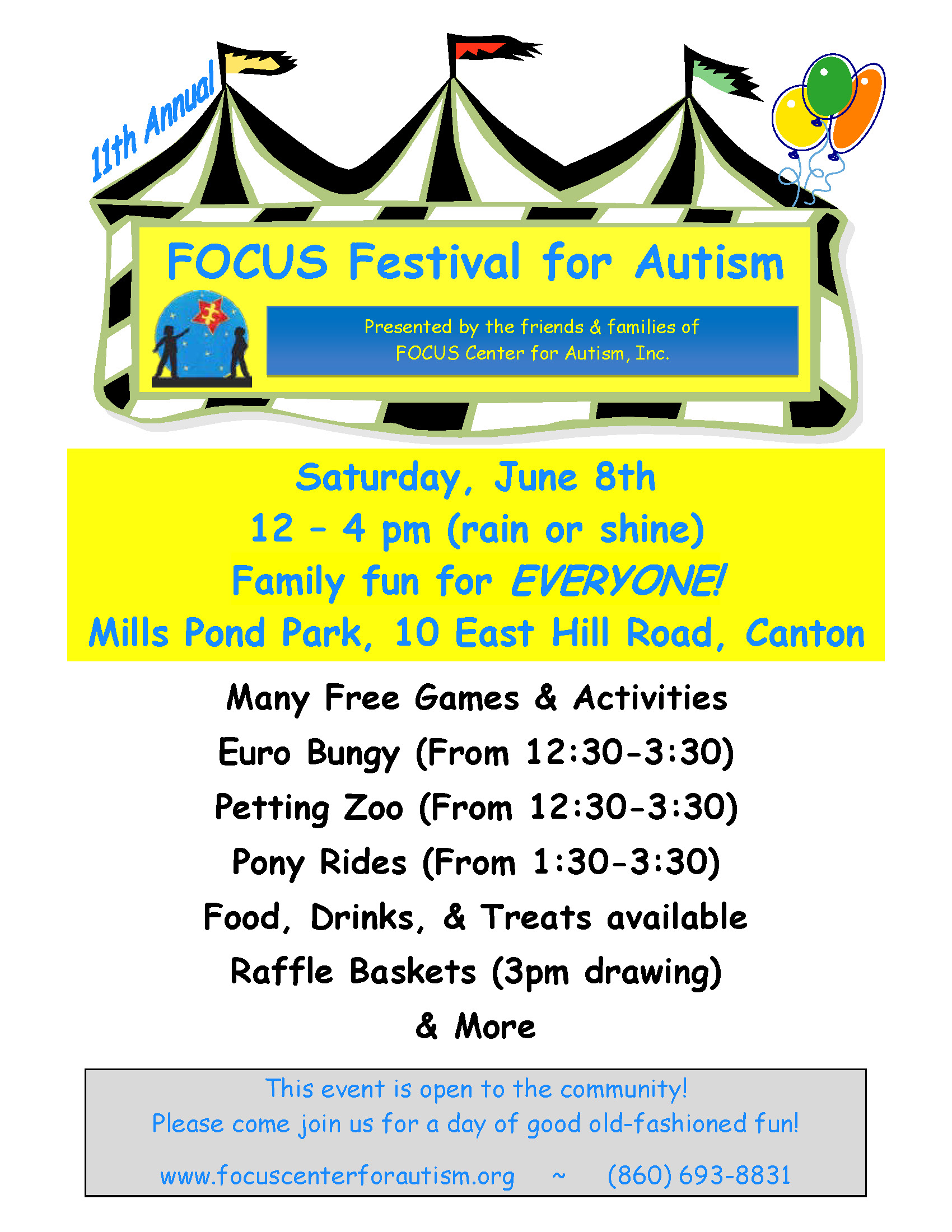 Come to the 11th annual FOCUS Festival for Autism! This is a safe, Autism-friendly carnival with food, games, a petting zoo, a Eurobungee, pony rides, a raffle, and lots of fun! Admission is free. For more information, visit www.focuscenterforautism.org