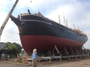 After nearly five years out of the water, the 1841 whaleship Charles W. Morgan took its first steps on her journey back to the Mystic River this morning. Shipwrights prepared to move the 300-ton ship onto a ship lift over the water in preparation for her launch, but first, the Morgan needed to be moved sideways to align with the lift and then rolled out onto the lift itself. The total distance will be a couple of hundred feet. The entire process is expected to complete by Wednesday evening.