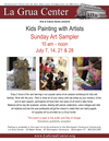Now in its third year, this year’s Sunday Art Sampler Workshop for kids and families will be held over fourconsecutive Sunday mornings in July. Come on down,enjoy 2 hours of fun and learning. Work with the pros -Paint or draw art of your choice with real artists as yourmentors. New this year: Puppet making! At the end of each session, participants will have their own piece of artwork to take home. Art supplies will be provided by La Grua Center.